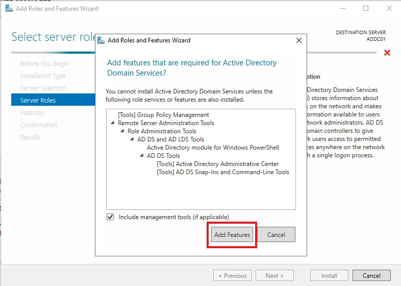- The required roles services and features to be installed for the AD DS role is shown on the next prompt. Let’s click on Add Features.