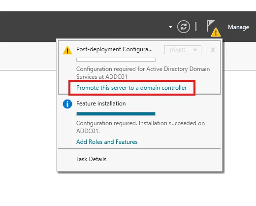 - From notifications, let’s choose the Promote this server to a domain controller option