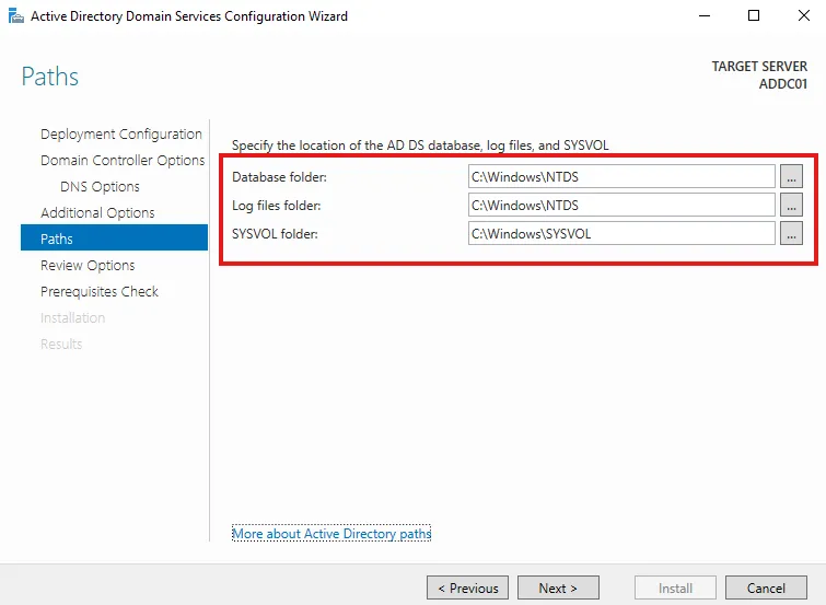 - The paths to store our database files named NTDS.dit are shown here. Attackers like to attack Domain Controllers as the database file contains everything related to Active Directory including password hashes. If any unauthorized activity is recognized involving this file, it can be assumed that the domain is compromised. I am leaving the default paths as they are.