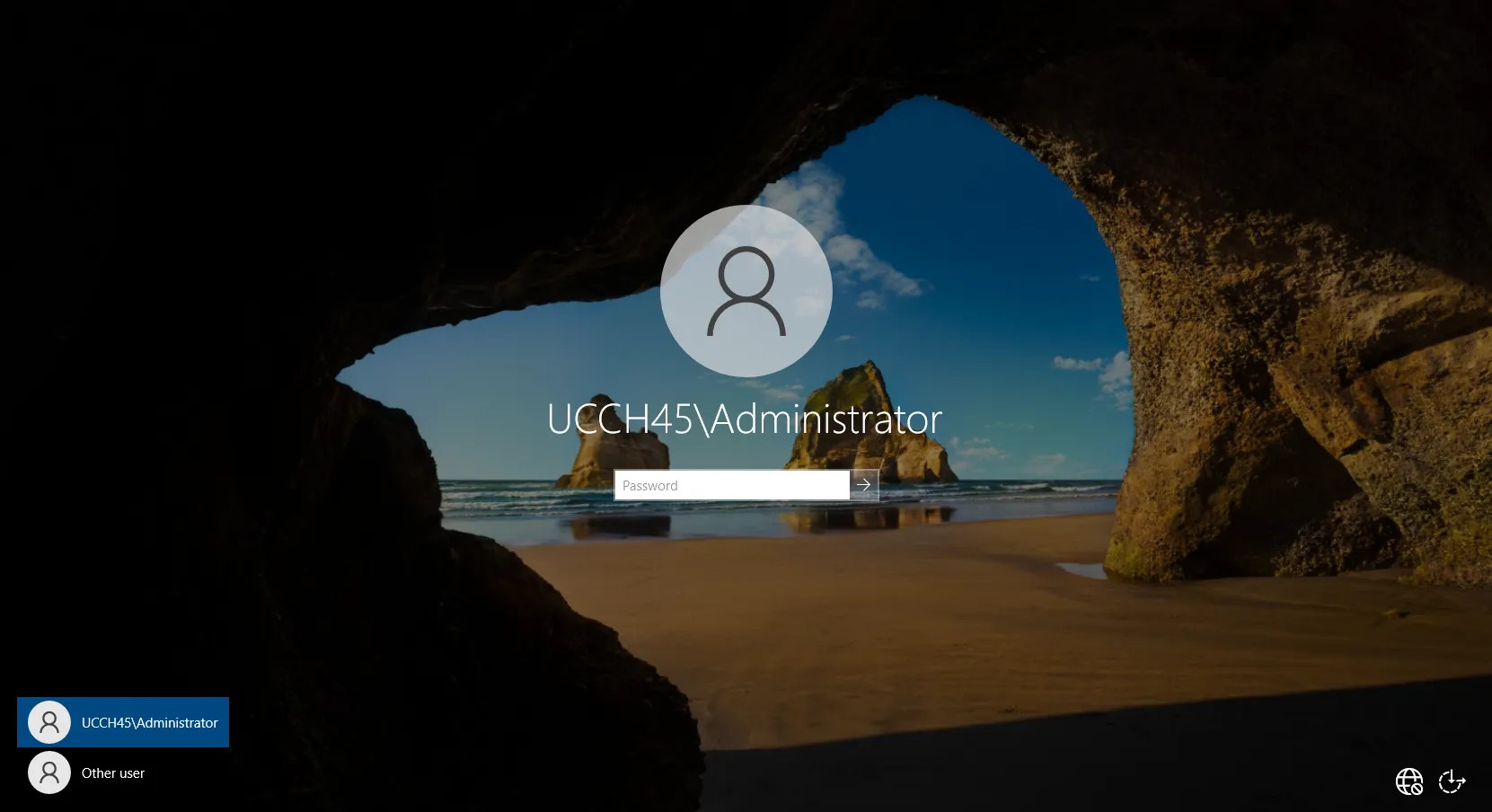- After the restart, the log in screen shows a user in format DOMAIN followed by a \ (backslash). This indicates that the installation of AD DS and the promotion of the server to DC was successful.