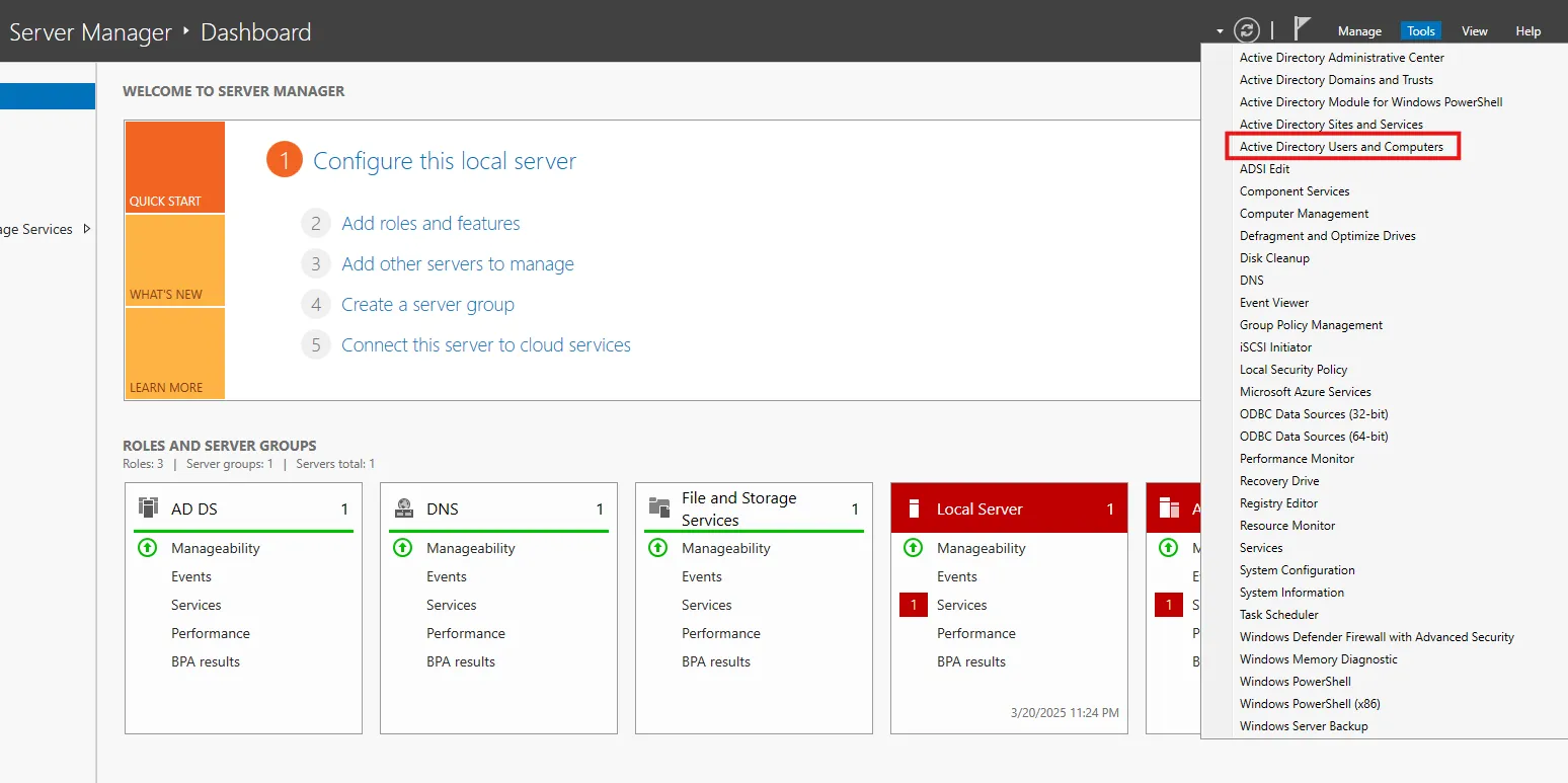 Let’s login to the Administrator account. From the Server Manager, under Tools, let’s select Active Directory Users and Computers. Using this we can create objects such as Users, Computers, Groups, and many more.