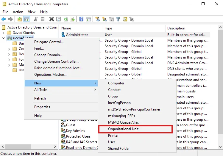 Similarly, Users contain automatically created user objects. In practice, real world users are generally part of Organizational Units(OUs). These can be a teams such as an IT/Finance/HR department within an organization. To create an OU, let’s select Organizational Unit under New within my domain.