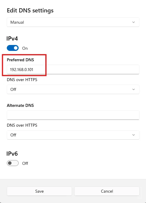 On the Windows 11 machine, let’s first set the preferred DNS to my DC