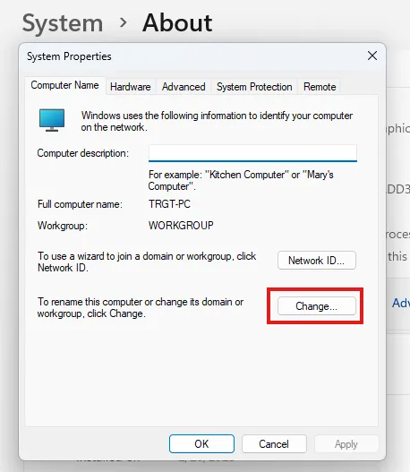 On the System Properties windows, click on Change under the Computer Name tab. I am selecting Domain under Member of and putting in my domain that I had configured previously.