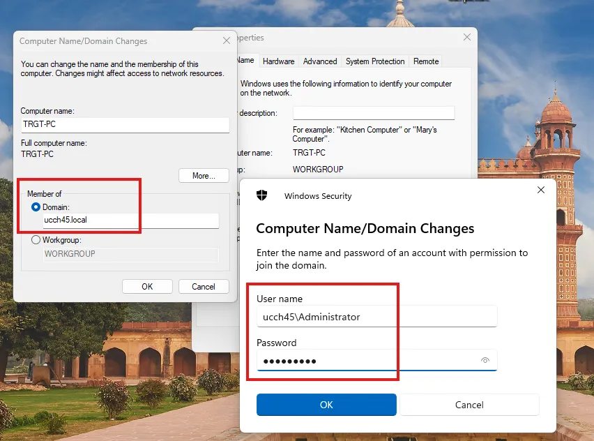 On the Windows Security prompt, I am using the Administrator credentials to authenticate the domain joining. After validation, a welcome message is shown indicating that the domain has been joined. However, in a real world environment, one shall create users and put them into a custom group that are authorized to allow computers to join the domain.