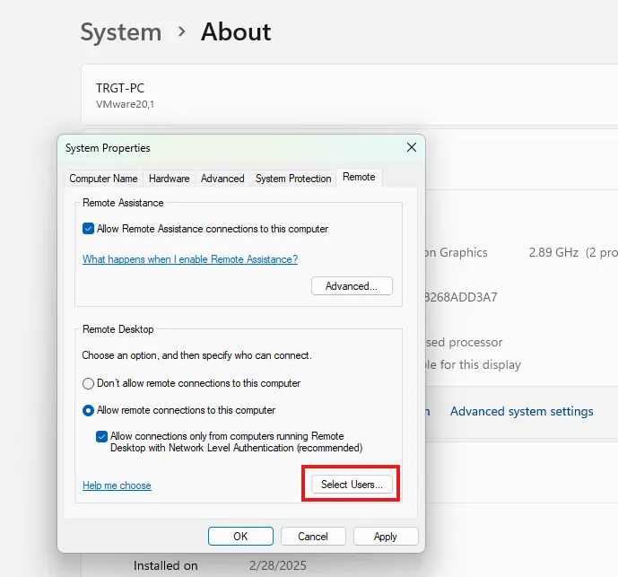 Log in using Administrator account to access the settings. On the System Properties window under the Remote tab, selecting the radio button Allot remote connections to this computer and then clicking on Select Users.