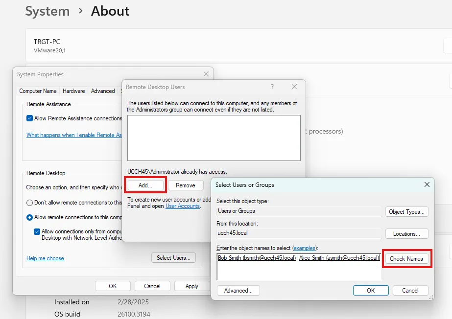 Click on Add to add users who will be able to remote into the machine. I am entering the name for Bob and Alice and clicking on Check Names for it automatically include the user object.