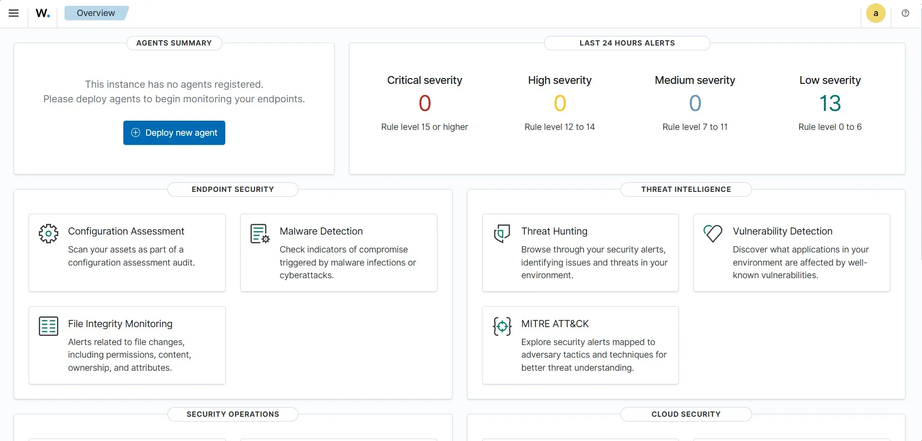 After the login, it lands on the Wazuh Overview page. Currently, It is showing no agents registered as I have not yet added any agents to Wazuh.