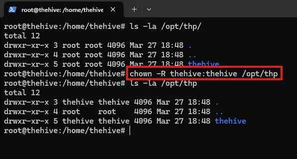 First, I need to make sure that TheHive’s user and group has access to the /opt/thp/ file path.