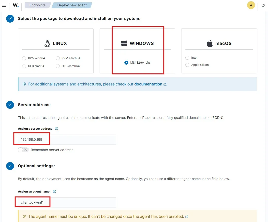 I am selecting Windows as the OS. The server for my Wazuh server is 192.168.0.169 I am assigning an agent name clientpc-win11 and leaving the group to Default