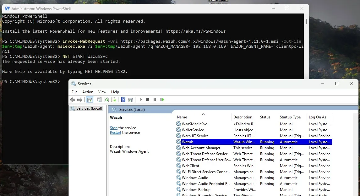 Invoke-WebRequest -Uri https://packages.wazuh.com/4.x/windows/wazuh-agent-4.11.0-1.msi -OutFile $env:tmp\wazuh-agent; msiexec.exe /i $env:tmp\wazuh-agent /q WAZUH_MANAGER='192.168.0.169' WAZUH_AGENT_NAME='clientpc-win11'